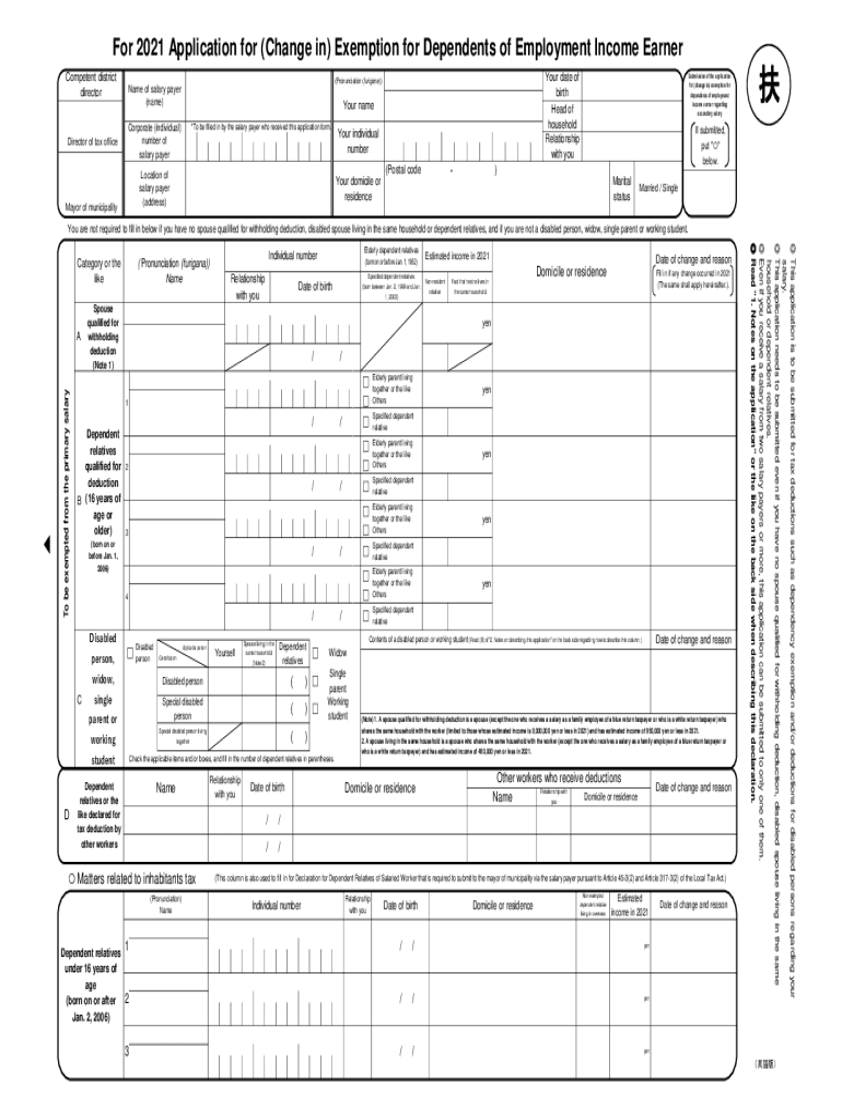 For 2021 Application for (Change in) Exemption for Dependents of Employment Income Earner Competent district directorCorporate (individual) number of salary payerDirector of tax officer name *To be