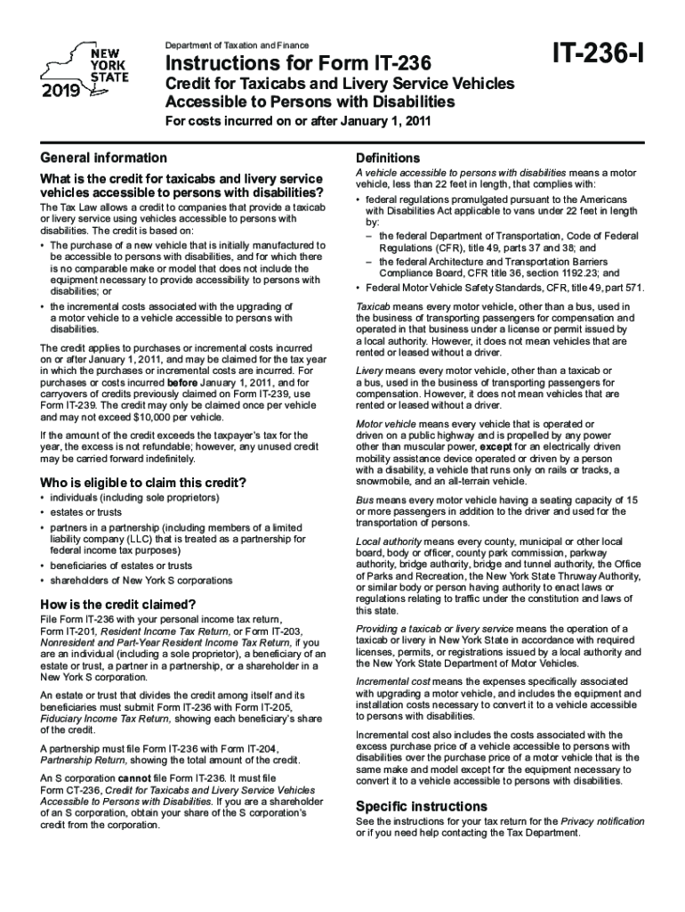 Department of Taxation and FinanceInstructions for Form IT236Credit for Taxicabs and Livery Service Vehicles Accessible to Persons with DisabilitiesIT236IFor costs incurred on or after January 1,