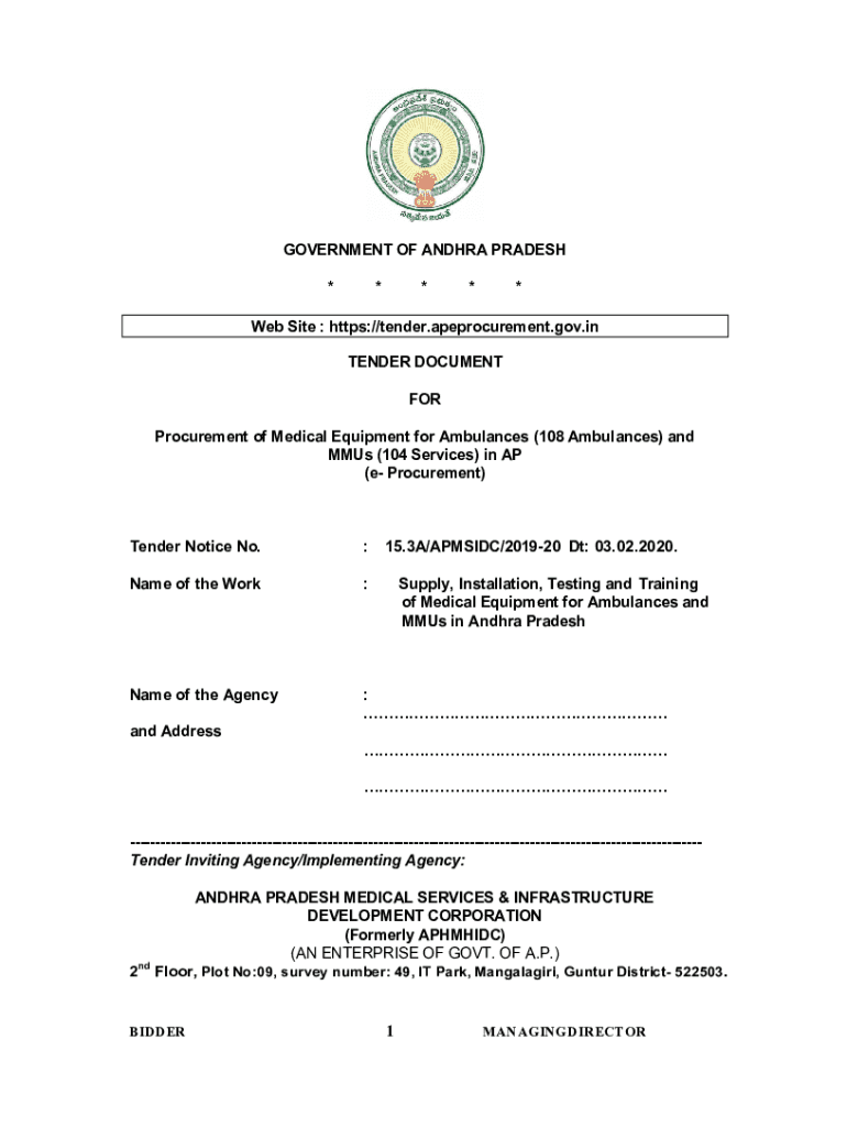 GOVERNMENT OF ANDHRA PRADESH *****Website : https://tender.apeprocurement.gov.in TENDER DOCUMENT FOR Procurement of Medical Equipment for Ambulances (108 Ambulances) and Imus (104 Services) in AP