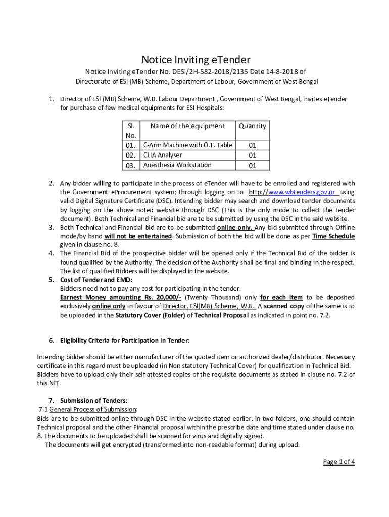 Notice Inviting eTenderNotice Inviting tender No. DESI/2H5822018/2135 Date 1482018 of Directorate of ESI (MB) Scheme, Department of Labor, Government of West Bengal 1. Director of ESI (MB) Scheme,