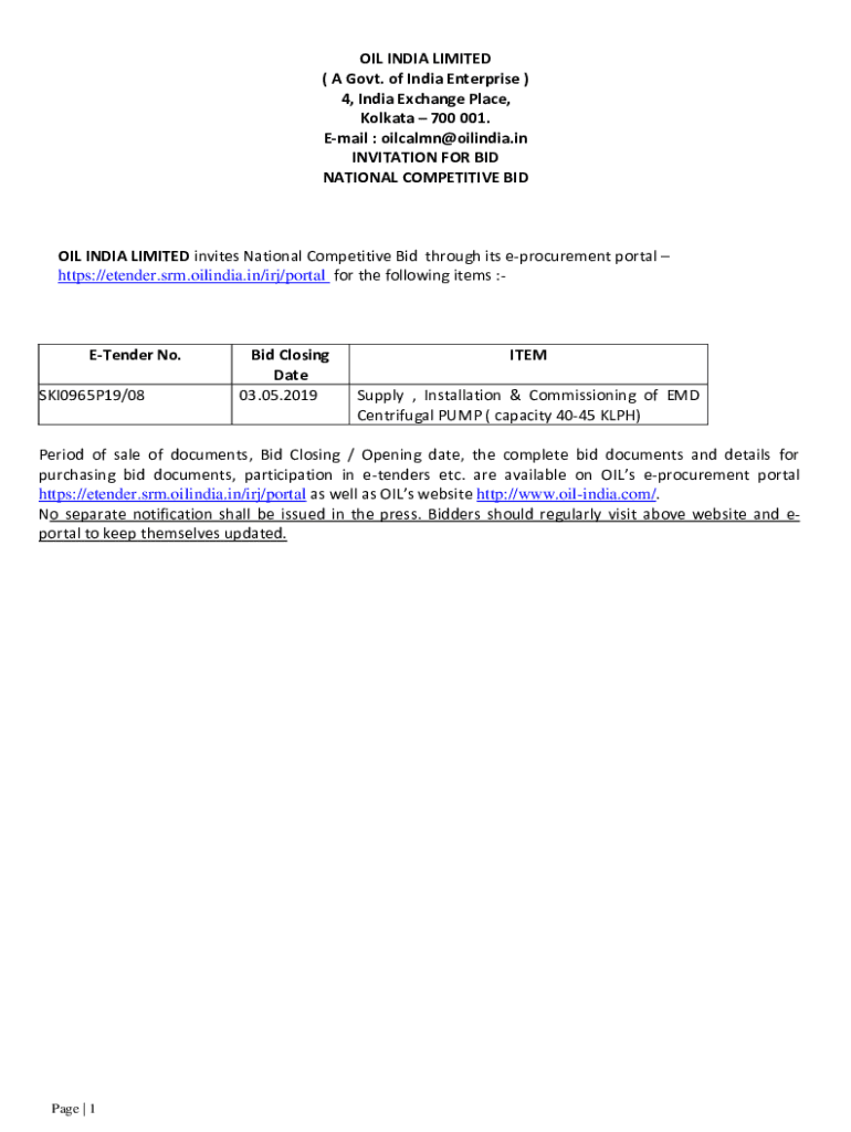 OIL INDIA LIMITED (A Govt. of India Enterprise) 4, India Exchange Place, Kolkata 700 001. Email : oilcan India.in INVITATION FOR BID NATIONAL COMPETITIVE IDOL INDIA LIMITED invites National Competitive