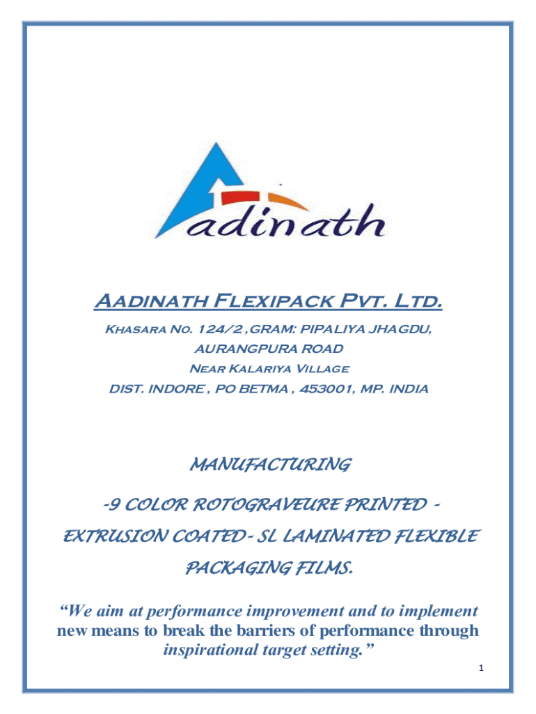 Radiant Flexipack Pvt. Ltd. Khazar No. 124/2, GRAM: PIPELINE HAD, AURANGPURA ROAD Near Malaria Village DIST. INDORE, PO BETA, 453001, MP. INDIAMANUFACTURING 9 COLOR ROTOGRAVURE PRINTED EXTRUSION COATED