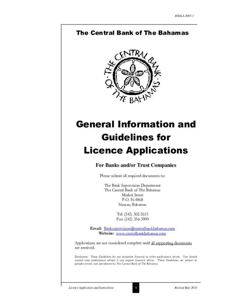BSDLA20051The Central Bank of The BahamasGeneral Information and Guidelines for License Applications For Banks and/or Trust Companies Please submit all required documents to: The Bank Supervision