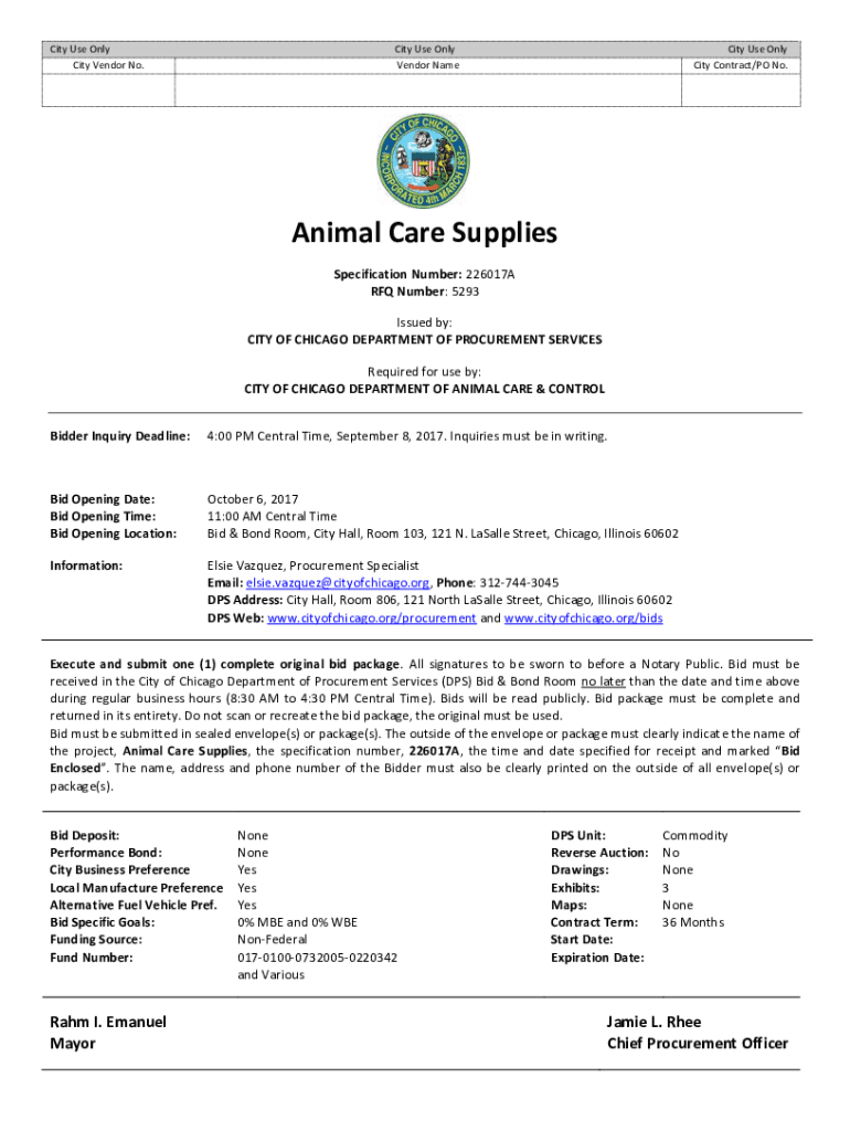 City Use Only City Vendor No. City Use Only Vendor Amenity Use Only City Contract/PO No. Animal Care Supplies Specification Number: 226017A RFQ Number: 5293 Issued by: CITY OF CHICAGO DEPARTMENT OF
