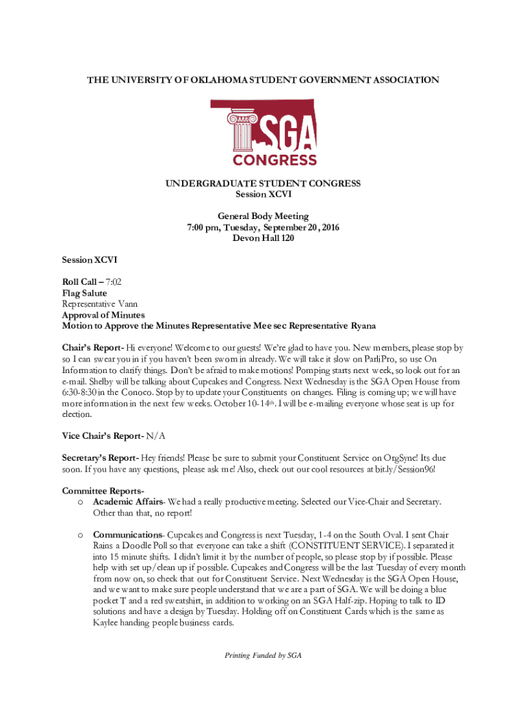 THE UNIVERSITY OF OKLAHOMA STUDENT GOVERNMENT ASSOCIATIONUNDERGRADUATE STUDENT CONGRESS Session XCVI General Body Meeting 7:00 pm, Tuesday, September 20, 2016, Devon Hall 120 Session XCVI Roll Call
