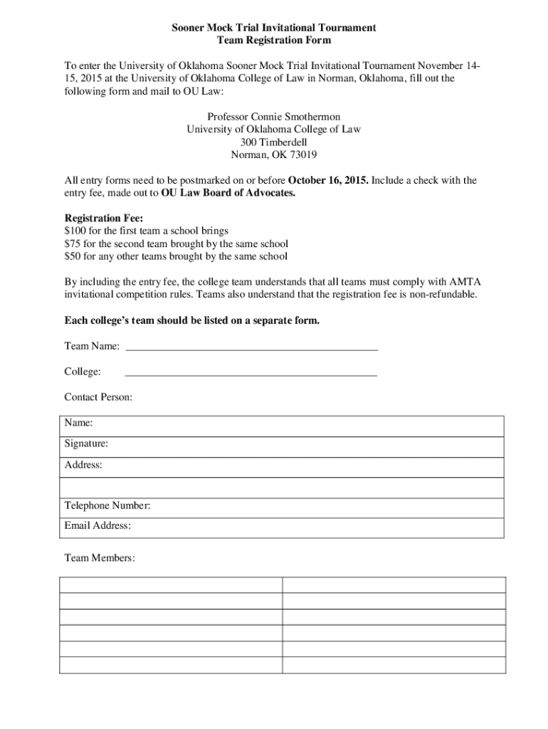 Sooner Mock Trial Invitational Tournament Team Registration Form To enter the University of Oklahoma Sooner Mock Trial Invitational Tournament November 1415, 2015 at the University of Oklahoma College