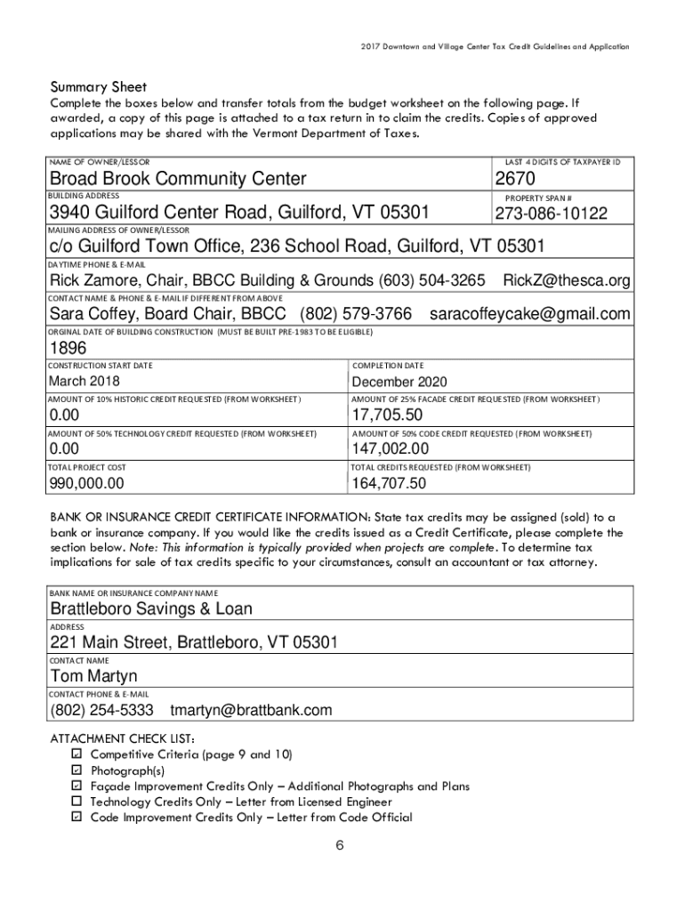 2017 Downtown and Village Center Tax Credit Guidelines and ApplicationSummary Sheet Complete the boxes below and transfer totals from the budget worksheet on the following page. If awarded, a copy