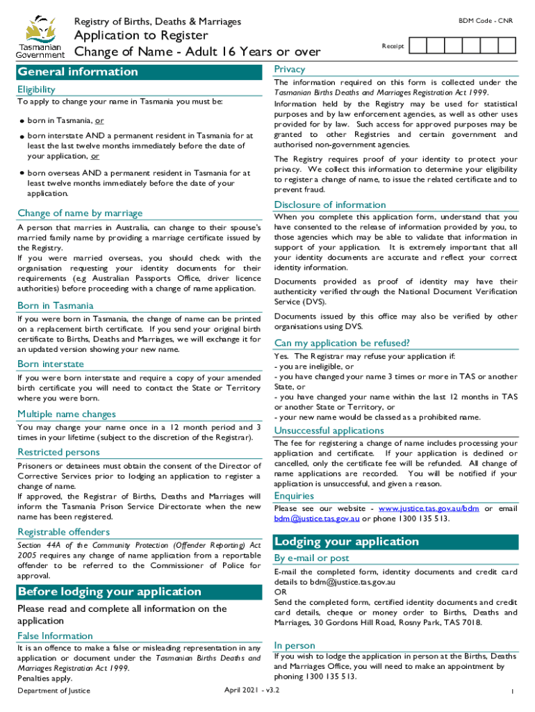 Registry of Births, Deaths & Marriages BDM Code Application to Register Change of Name Adult 16 Years or over PrivacyGeneral information Eligibility To apply to change your name in Tasmania you must