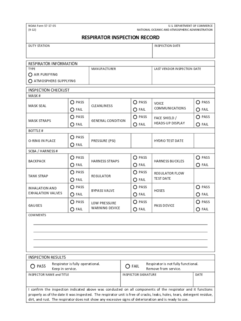 NOAA Form 571705 (912)U.S. DEPARTMENT OF COMMERCE NATIONAL OCEANIC AND ATMOSPHERIC ADMINISTRATIONRESPIRATOR INSPECTION RECORD DUTY STATIONINSPECTION DATERESPIRATOR INFORMATION TYPEMANUFACTURERLAST
