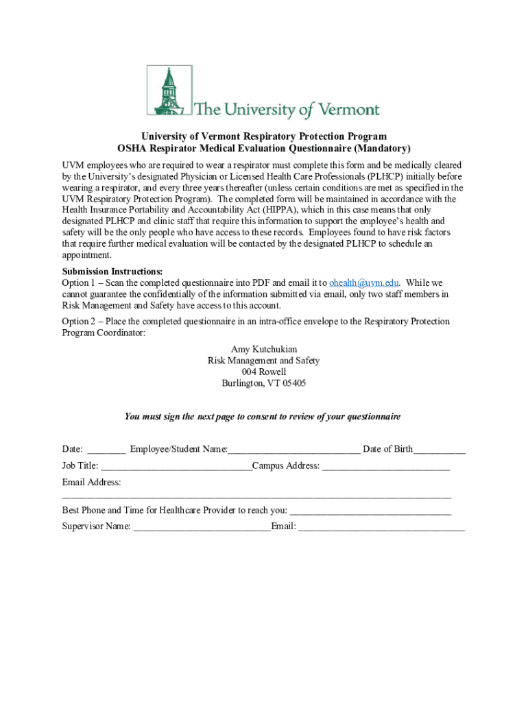 University of Vermont Respiratory Protection Program OSHA Respirator Medical Evaluation Questionnaire (Mandatory) UVM employees who are required to wear a respirator must complete this form and be