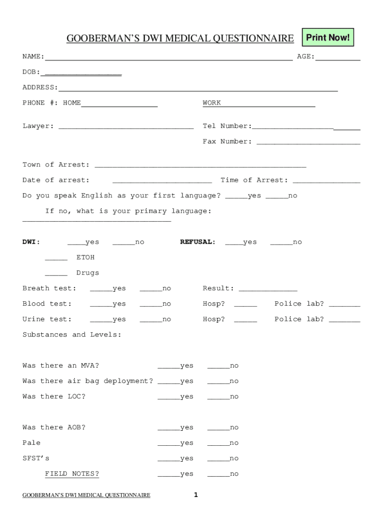 Print Now!DOBERMANS DWI MEDICAL QUESTIONNAIRE NAME:AGE:DOB: ADDRESS: PHONE #: HOMEWORKLawyer: Tel Number: Fax Number: Town of Arrest: Date of arrest: Time of Arrest: Do you speak English as your first