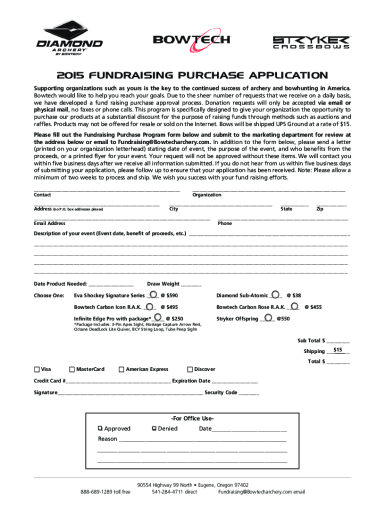 2015 FUNDRAISING PURCHASE APPLICATION Supporting organizations such as yours is the key to the continued success of archery and bow hunting in America. Bow tech would like to help you reach your goals.