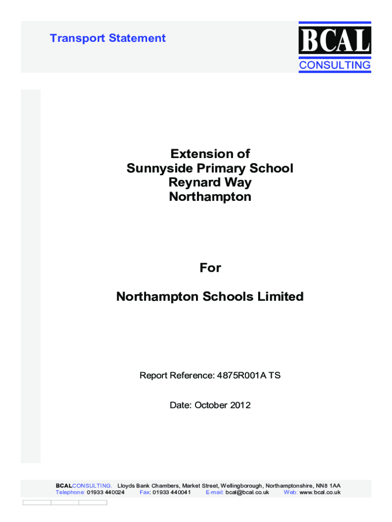 Transport StatementExtension of Sunnyside Primary School Maynard Way Northampton Schools LimitedReport Reference: 4875R001A TS Date: October 2012BCALCONSULTING. Lloyd's Bank Chambers, Market Street,