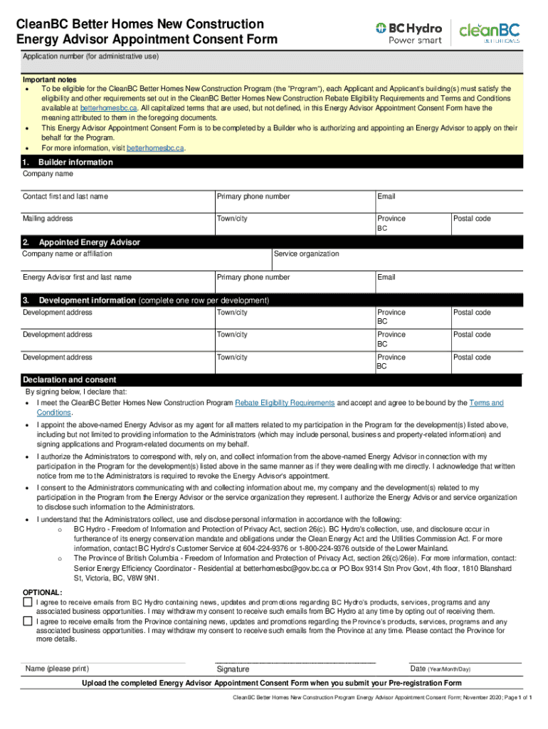 Clean BC Better Homes New Construction Energy Advisor Appointment Consent Form Application number (for administrative use) Important notes To be eligible for the Clean BC Better Homes New Construction