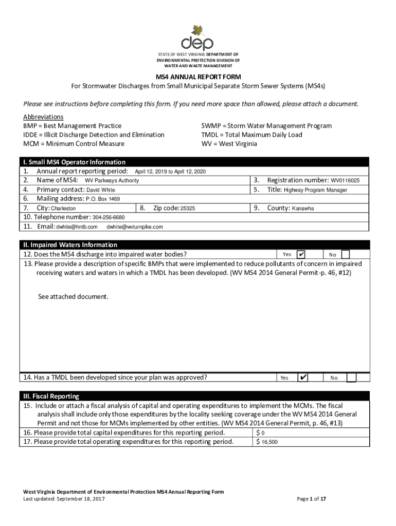 STATE OF WEST VIRGINIA DEPARTMENT OF ENVIRONMENTAL PROTECTION DIVISION OF WATER AND WASTE MANAGEMENTMS4 ANNUAL REPORT FORM For Stormwater Discharges from Small Municipal Separate Storm Sewer Systems