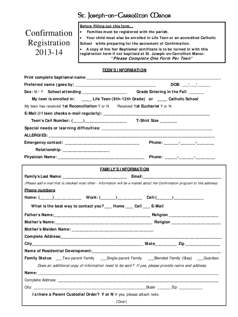St. JosephonCarrollton Manor Before Filling out this form... Confirmation Registration 201314 Families must be registered with the parish. Your child must also be enrolled in Life Teen or an accredited