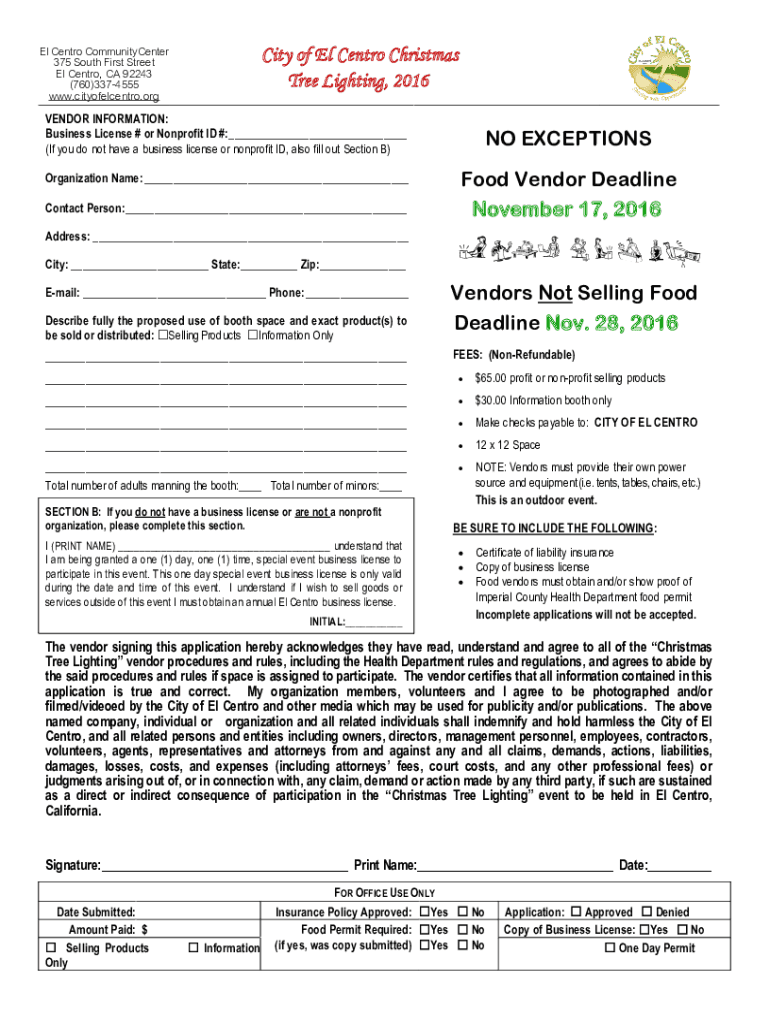 El CENTR Community Center 375 South First Street El CENTR, CA 92243 (760)3374555 www.cityofelcentro.orgCity of El CENTR Christmas Tree Lighting, 2016VENDOR INFORMATION: Business License # or Nonprofit