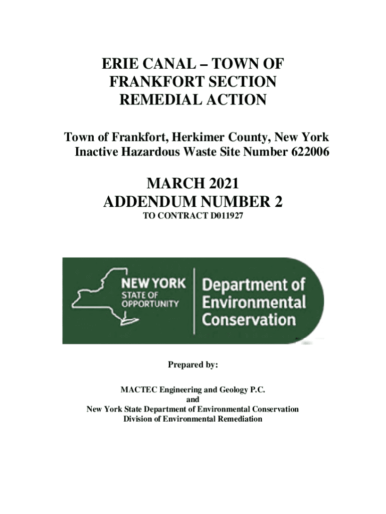 ERIE CANAL TOWN OF FRANKFORT SECTION REMEDIAL ACTION Town of Frankfort, Perkier County, New York Inactive Hazardous Waste Site Number 622006MARCH 2021 ADDENDUM NUMBER 2 TO CONTRACT D011927Prepared