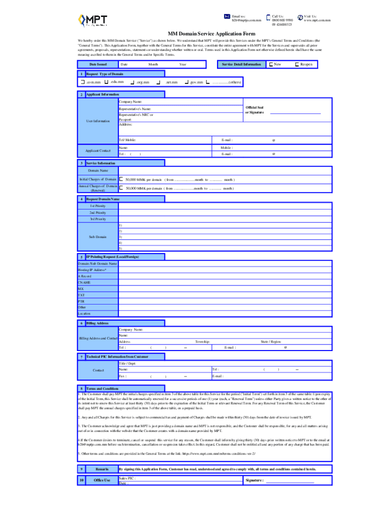 Email us: b2b mptjo.com. McCall Us: 0800 800 9990 09 426000323Visit Us: www.mpt.com.mmMM Domain Service Application Form We hereby order this MM Domain Service (“Service “) as shown below. We