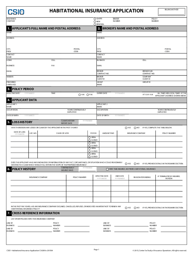 HABITATION AL INSURANCE APPLICATION QUOTE NEW RENEWALINSURANCE COMPANY1. APPLICANT\'S FULL NAME AND POSTAL ADDRESSBINDER NUMBERPOLICY NUMBER2. BROKER\'S NAME AND POSTAL ADDRESSNAMENAMEADDRESSADDRESSCITY,