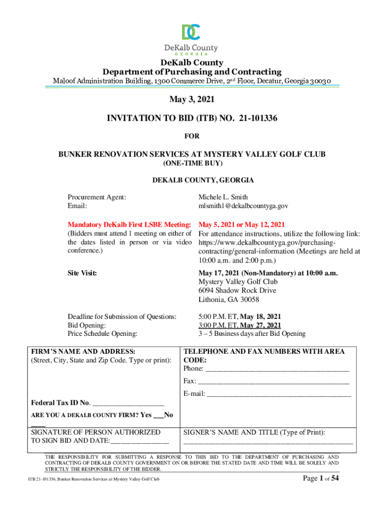 DeKalb County Department of Purchasing and Contracting Aloof Administration Building, 1300 Commerce Drive, 2nd Floor, Decatur, Georgia 30030May 3, 2021 INVITATION TO BID (ITB) NO. 21101336 FOUNDER