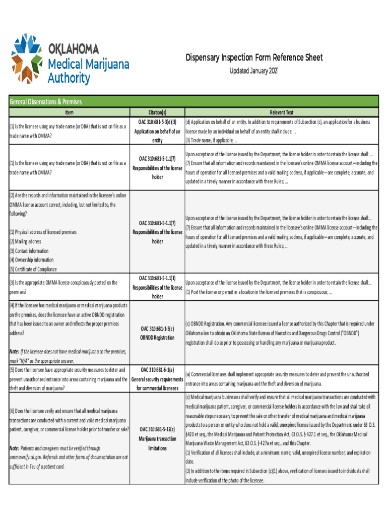 Dispensary Inspection Form Reference Sheet Updated January 2021General Observations & Premises Item (1) Is the licensee using any trade name (or DBA) that is not on file as a trade name with EMMA?(1)