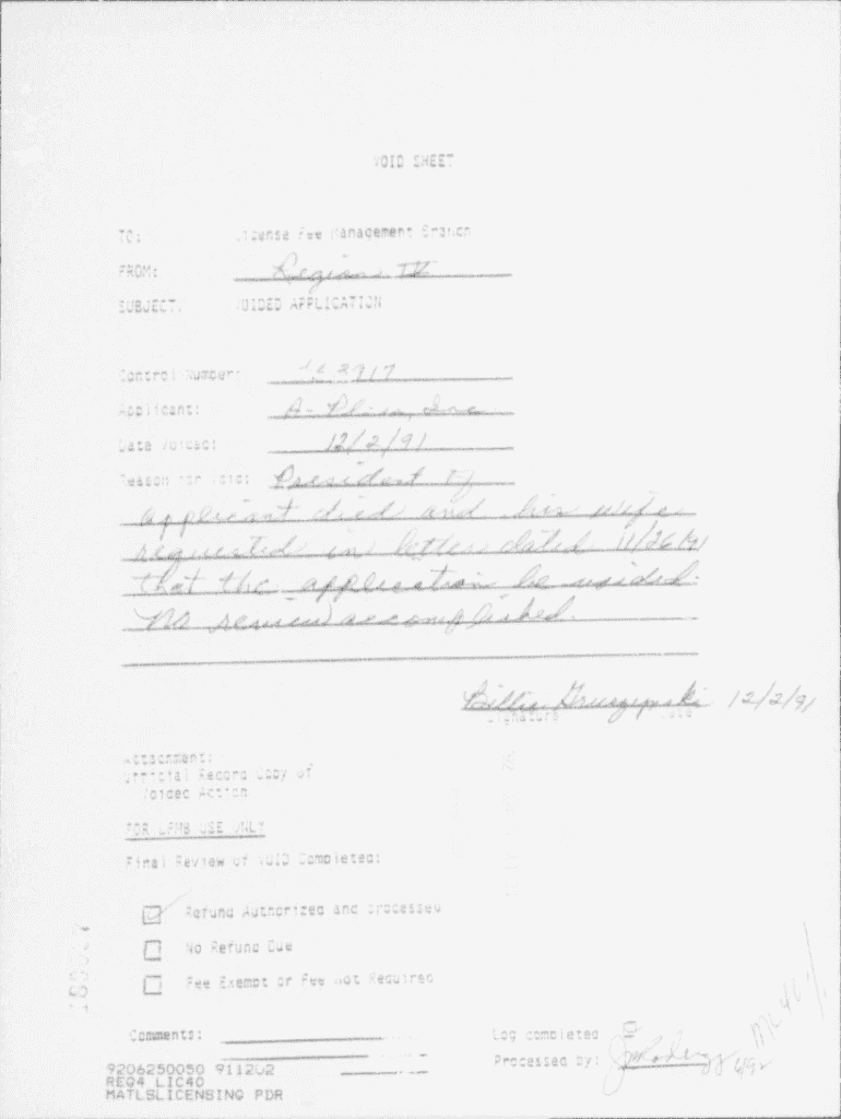 Indicate the reason for the voided materials licensing action and provide any supporting documentation or evidence.