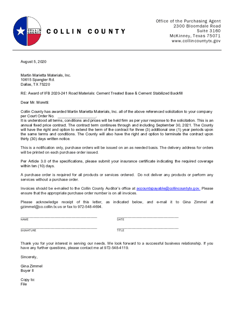 COLLIN COUNTY Office of the Purchasing Agent 2300 Bloom dale Road Suite 3160 McKinney, Texas 75071 www.collincountytx.govAugust 5, 2020 Martin Marietta Materials, Inc. 10615 Spangler Rd. Dallas, TX