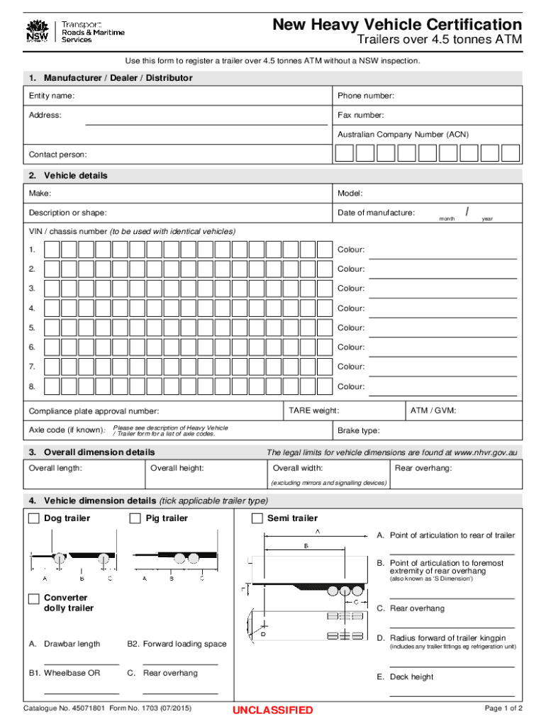 New Heavy Vehicle Certification Trailers over 4.5 tonnes ATM Uses this form to register a trailer over 4.5 tonnes ATM without a NSW inspection.1. Manufacturer / Dealer / Distributor Entity name:Phone
