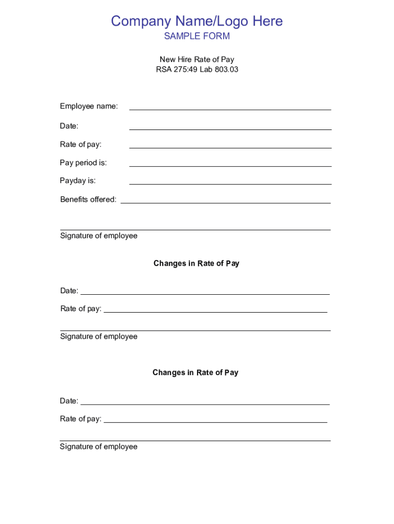 Company Name/Logo Here SAMPLE Former Hire Rate of Pay RSA 275:49 Lab 803.03Employee name: Date: Rate of pay: Pay period is: Payday is: Benefits offered: Signature of employee Changes in Rate of Pay