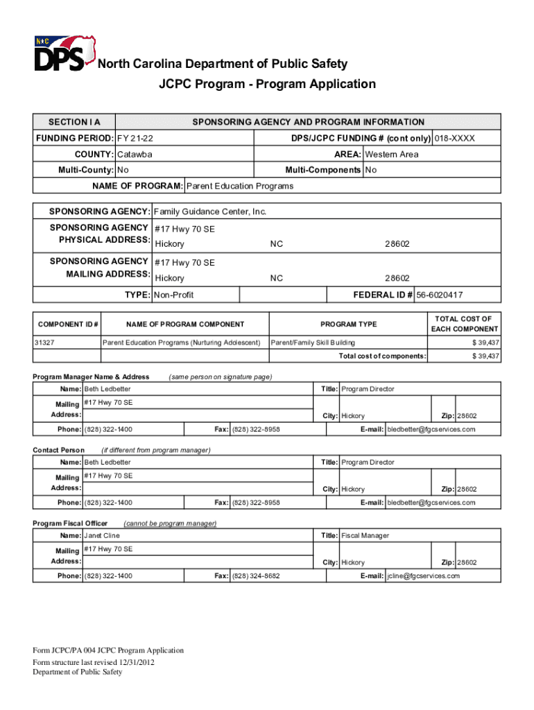 North Carolina Department of Public Safety CPC Program Application SECTION I SPONSORING AGENCY AND PROGRAM INFORMATIONFUNDING PERIOD: FY 2122DPS/CPC FUNDING # (cont only) 018XXXXCOUNTY: CatawbaAREA:
