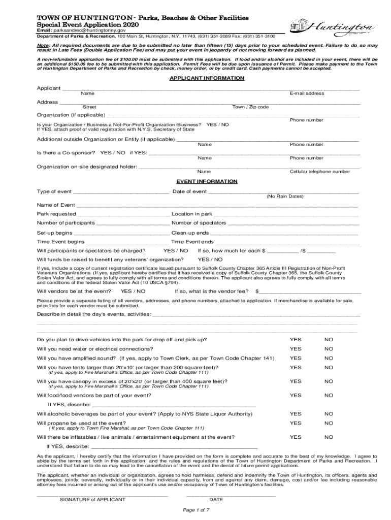 TOWN OF H U N T I NG T O N Parks, Beaches & Other Facilities Special Event Application 2020 Email: parksandrec Huntington.gov Department of Parks & Recreation, 100 Main St, Huntington, N.Y. 11743,