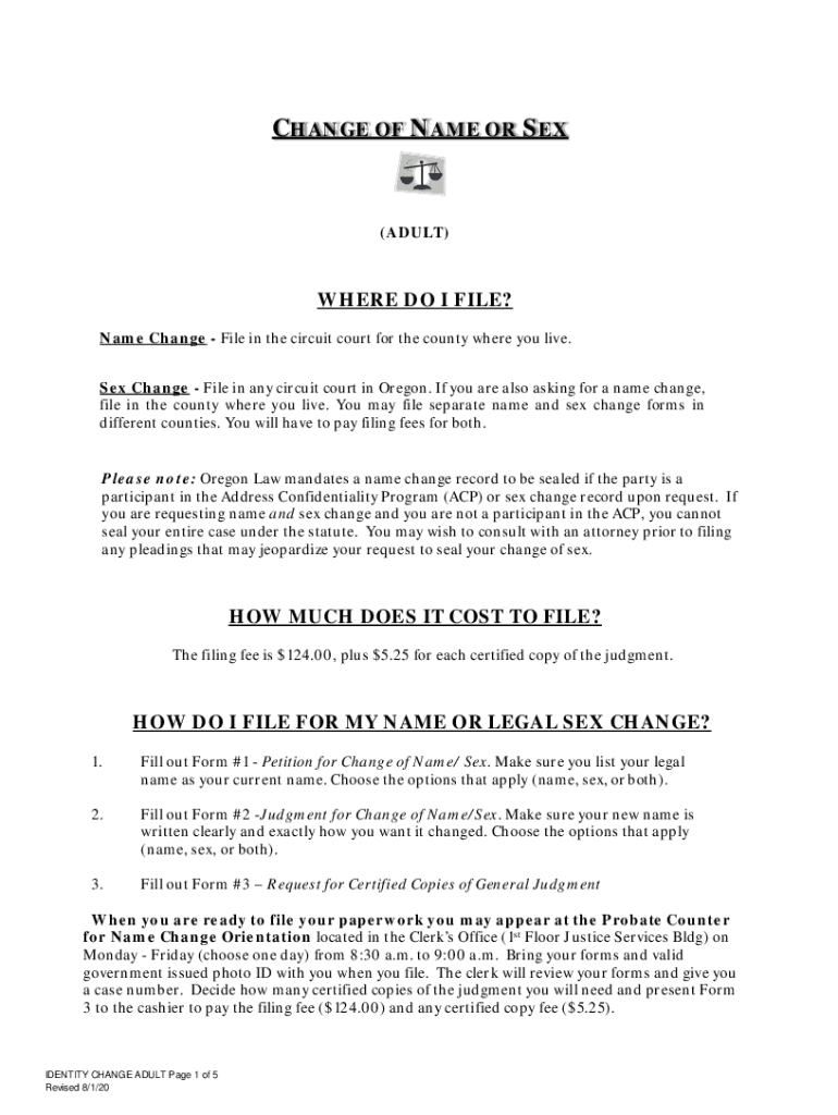 CHANGE OF NAME OR SEX(ADULT)WHERE DO I FILE? Name Change File in the circuit court for the county where you live. Sex Change File in any circuit court in Oregon. If you are also asking for a name