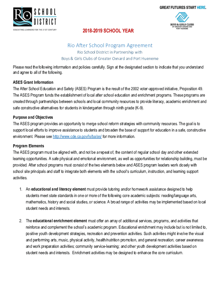 20182019 SCHOOL YEAR Rio After School Program Agreement Rio School District in Partnership with Boys & Girls Clubs of Greater Oxnard and Port Hence Please read the following information and policies