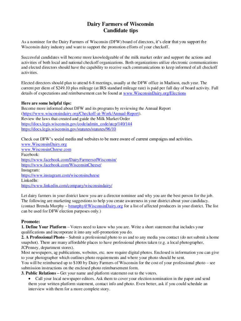 Dairy Farmers of Wisconsin Candidate tips As a nominee for the Dairy Farmers of Wisconsin (DFW) board of directors, it's clear that you support the Wisconsin dairy industry and want to support the