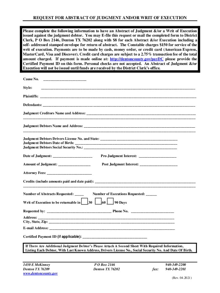 REQUEST FOR ABSTRACT OF JUDGMENT AND/OR WRIT OF EXECUTION Please complete the following information to have an Abstract of Judgment &/or a Writ of Execution issued against the judgment debtor. You