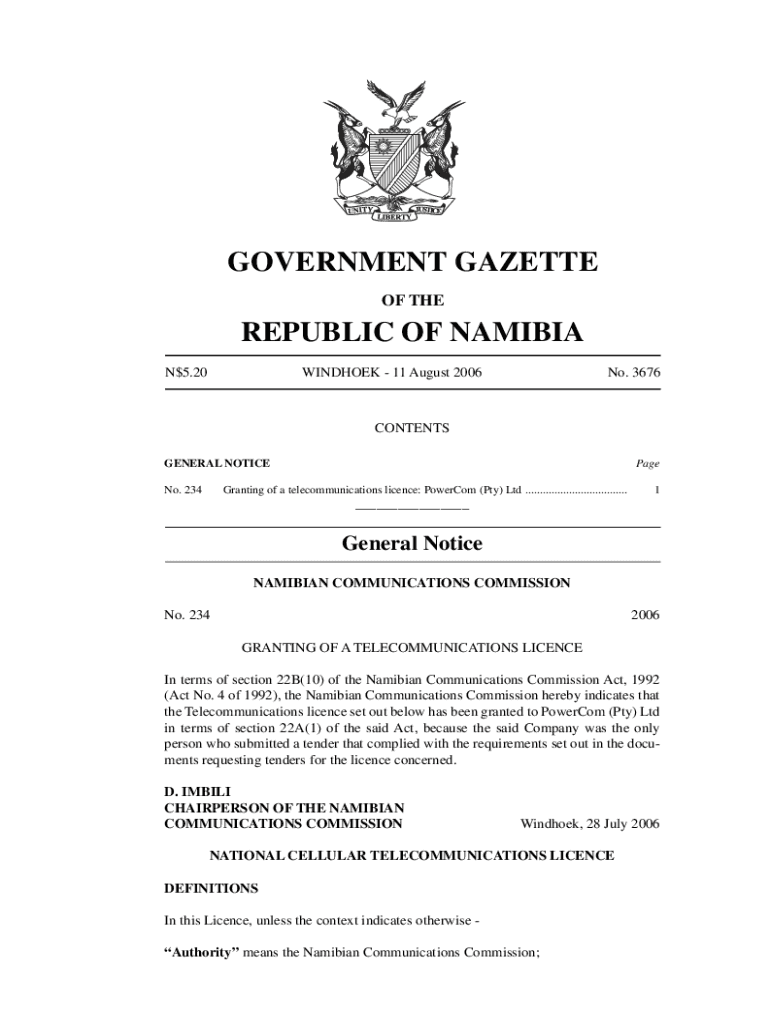 No. 3676Government Gazette 11 August 20061GOVERNMENT GAZETTE OF REPUBLIC OF NAMIBIA N$5.20WINDHOEK 11 August 2006No. 3676CONTENTS GENERAL NOTICE No. 234PageGranting of a telecommunications license: