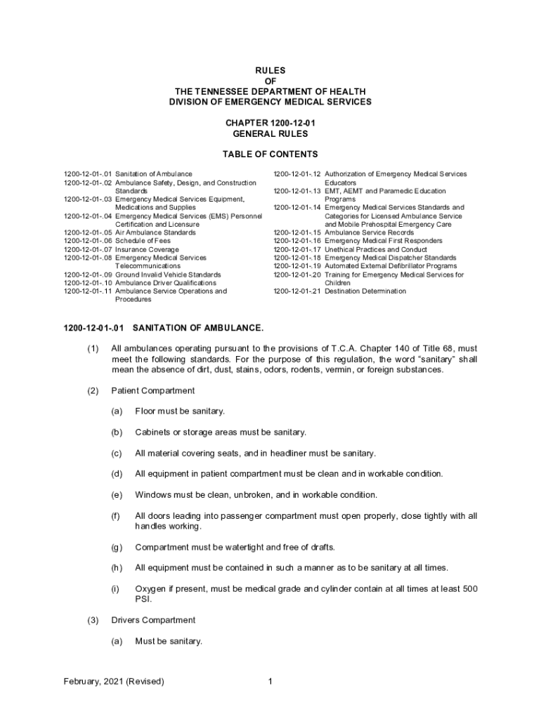 RULES OF THE TENNESSEE DEPARTMENT OF HEALTH DIVISION OF EMERGENCY MEDICAL SERVICES CHAPTER 12001201 GENERAL RULES TABLE OF CONTENTS 12001201.01 Sanitation of Ambulance 12001201.02 Ambulance Safety,