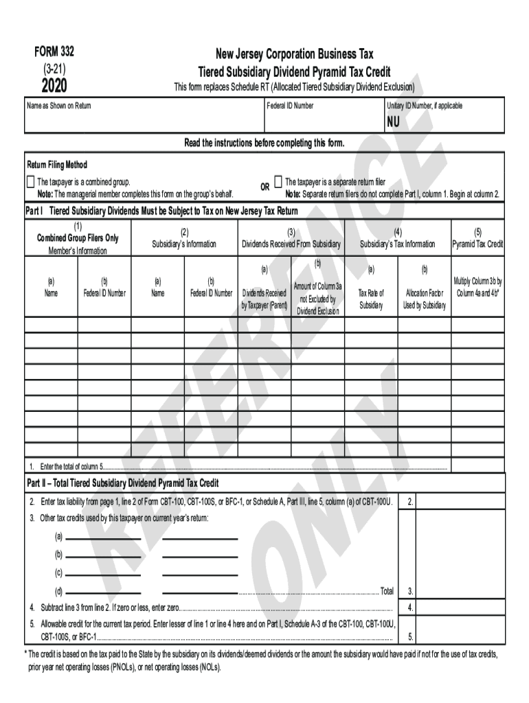 FORM 332 (321)New Jersey Corporation Business Tax Tiered Subsidiary Dividend Pyramid Tax Credit2020This form replaces Schedule RT (Allocated Tiered Subsidiary Dividend Exclusion)Name as Shown on Return