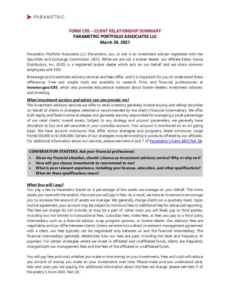 FORM CRS CLIENT RELATIONSHIP SUMMARY PARAMETRIC PORTFOLIO ASSOCIATES LLC March 30, 2021, Parametric Portfolio Associates LLC (Parametric, our, or we) is an investment adviser registered with the Securities
