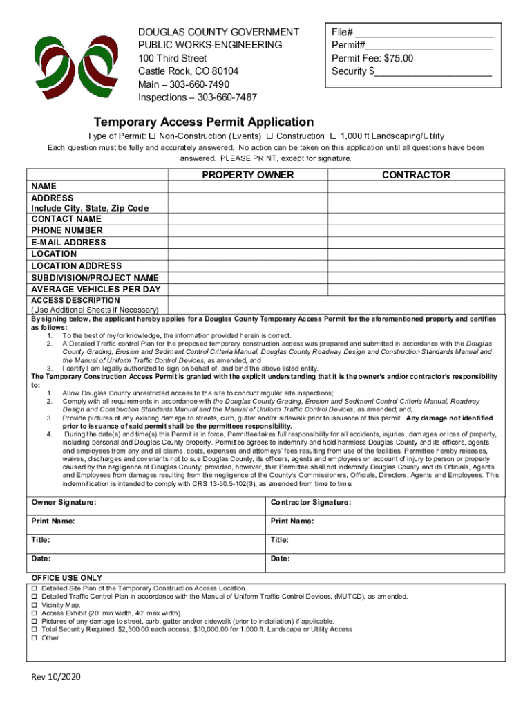 DOUGLAS COUNTY GOVERNMENT PUBLIC WORKSENGINEERING 100 Third Street Castle Rock, CO 80104 Main 3036607490 Inspections 3036607487File# Permit# Permit Fee: $75.00 Security $ Temporary Access Permit ApplicationType