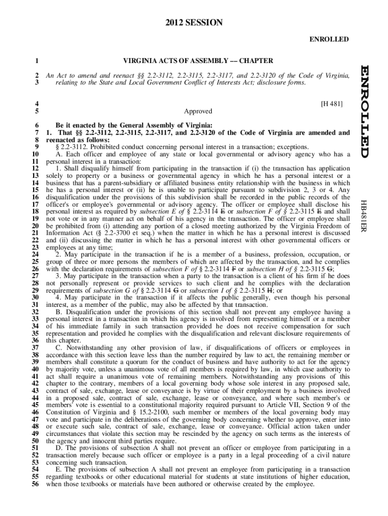 2012 SESSION ENROLLED2 3An Act to amend and reenact 2.23112, 2.23115, 2.23117, and 2.23120 of the Code of Virginia, relating to the State and Local Government Conflict of Interests Act; disclosure