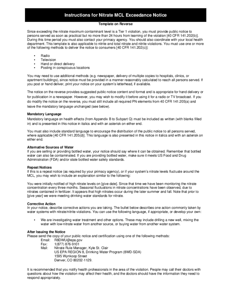 Instructions for Nitrate MCL Exceedable Notice Template on Reverse Since exceeding the nitrate maximum contaminant level is a Tier 1 violation, you must provide public notice to persons served as