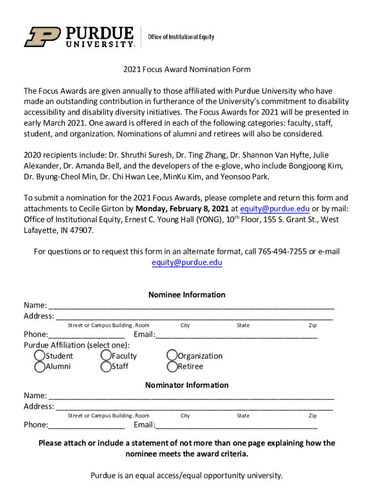 2021 Focus Award Nomination Form The Focus Awards are given annually to those affiliated with Purdue University who have made an outstanding contribution in furtherance of the Universities' commitment