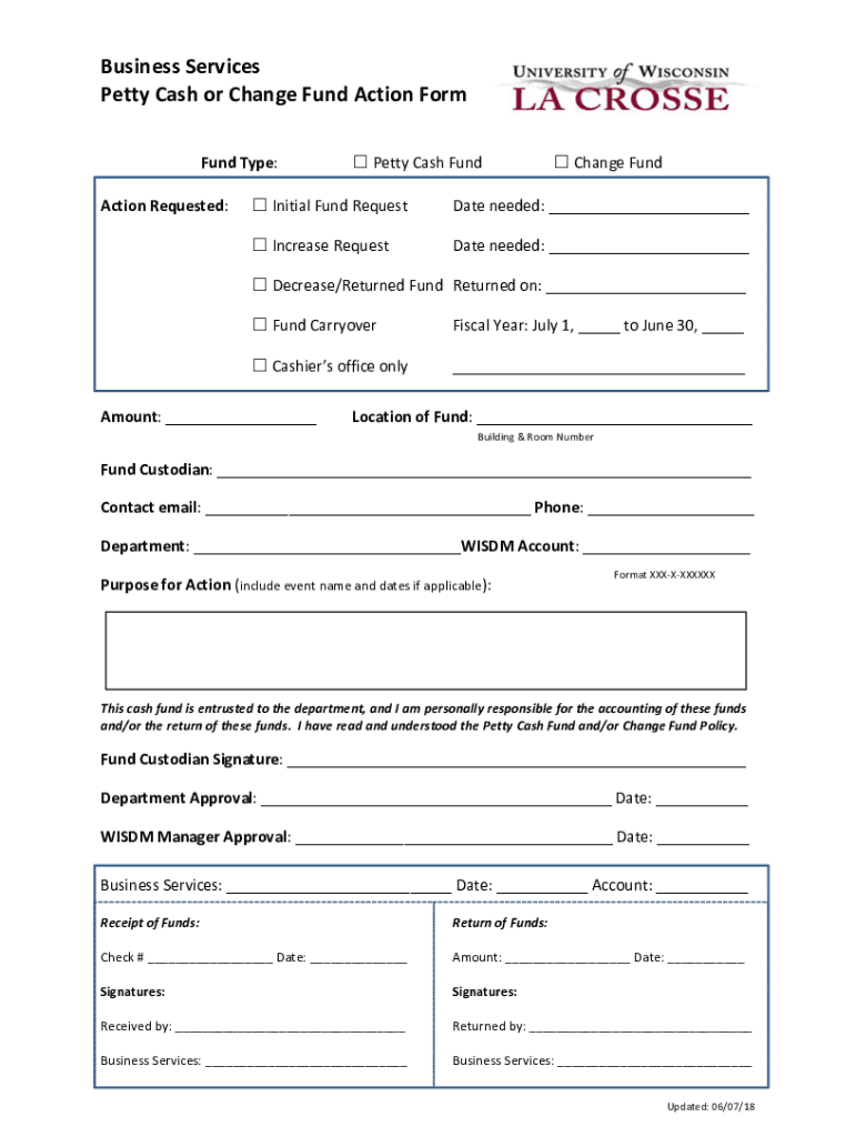 Business Services Petty Cash or Change Fund Action Form Fund Type: Action Requested: Petty Cash Fund Change Fund Initial Fund Sequestrate needed: Increase Sequestrate needed: Decrease/Returned Fund