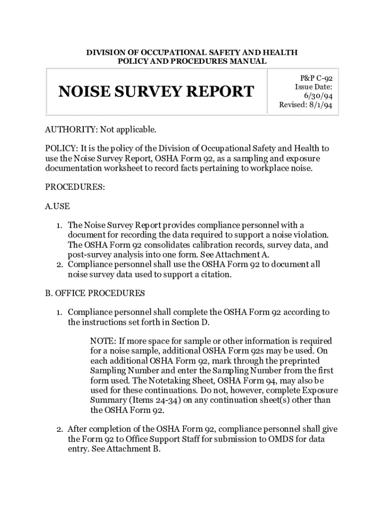 DIVISION OF OCCUPATIONAL SAFETY AND HEALTH POLICY AND PROCEDURES MANUALNOISE SURVEY REPORT C92 Issue Date: 6/30/94 Revised: 8/1/94AUTHORITY: Not applicable. POLICY: It is the policy of the Division