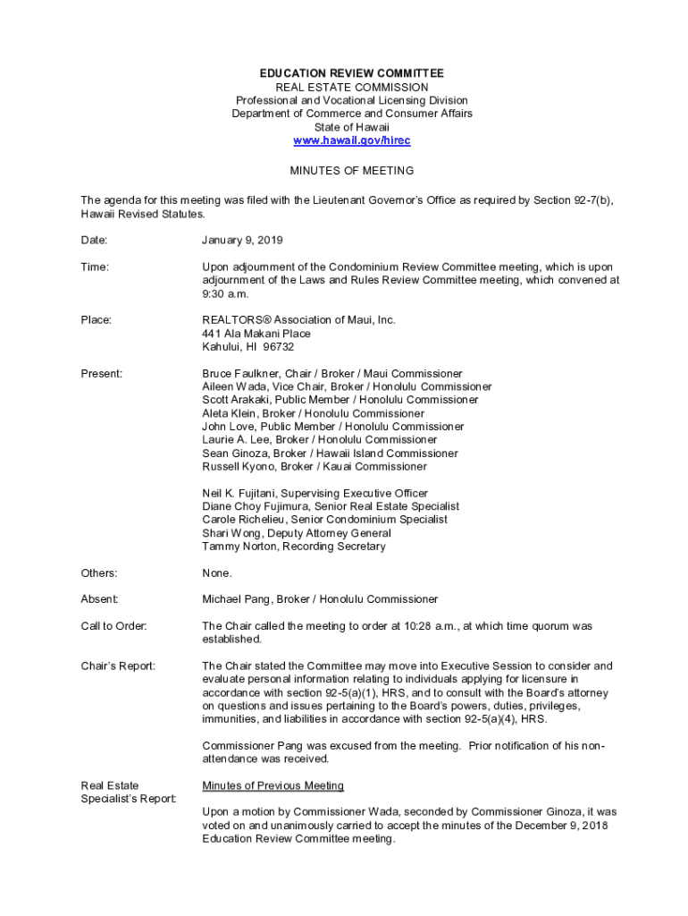 EDUCATION REVIEW COMMITTEE REAL ESTATE COMMISSION Professional and Vocational Licensing Division Department of Commerce and Consumer Affairs State of Hawaii www.hawaii.gov/hirec MINUTES OF MEETING