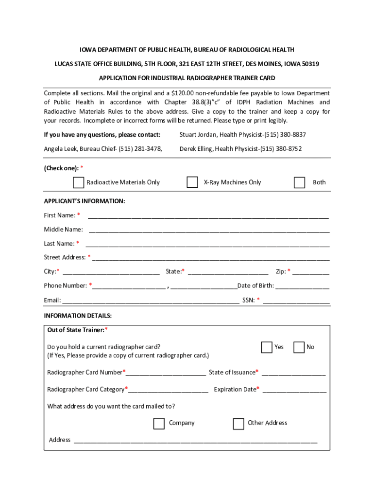 IOWA DEPARTMENT OF PUBLIC HEALTH, BUREAU OF RADIOLOGICAL HEALTH LUCAS STATE OFFICE BUILDING, 5TH FLOOR, 321 EAST 12TH STREET, DES MOINES, IOWA 50319 APPLICATION FOR INDUSTRIAL RADIOGRAPHER TRAINER