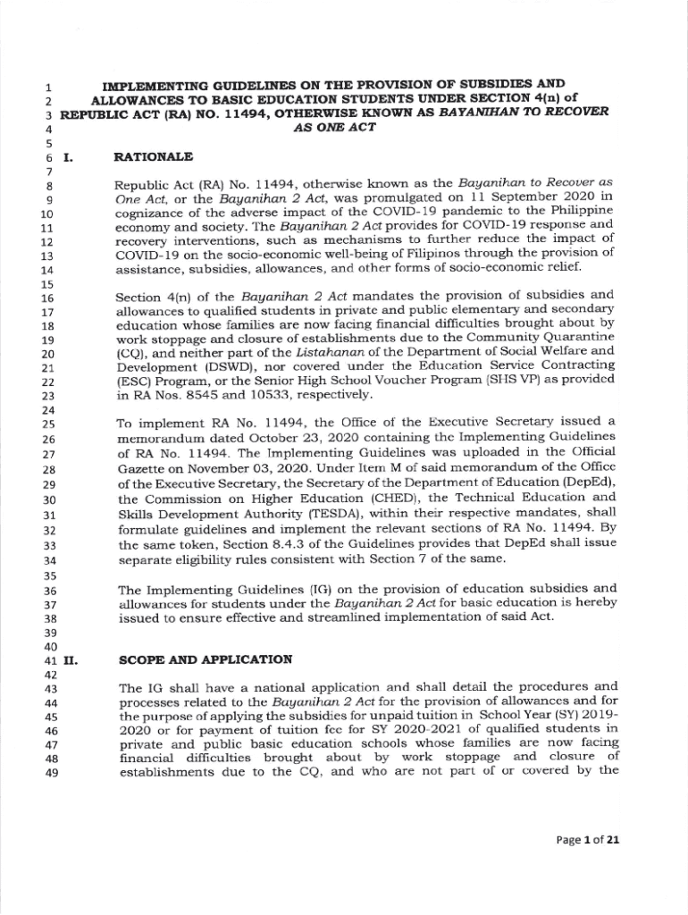 1 234IMPLEUENTING GI\'SIDELINES OT THE PROVISION OF SI\'BODIES, FIND ALLIANCES TO BASIC EDUCATION STUDENTS UNDER SECTION 4(n) of REPUBLIC ACT oral lo. 11494, OTHERWISE SNOUT AS AAYAMIIAiI 11O Recover