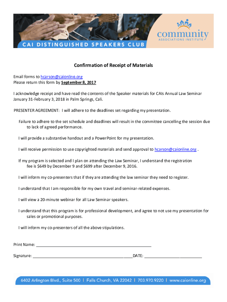 Confirmation of Receipt of Materials Email forms to hcarson@caionline.org Please return this form by September 8, 2017, I acknowledge receipt and have read the contents of the Speaker materials for